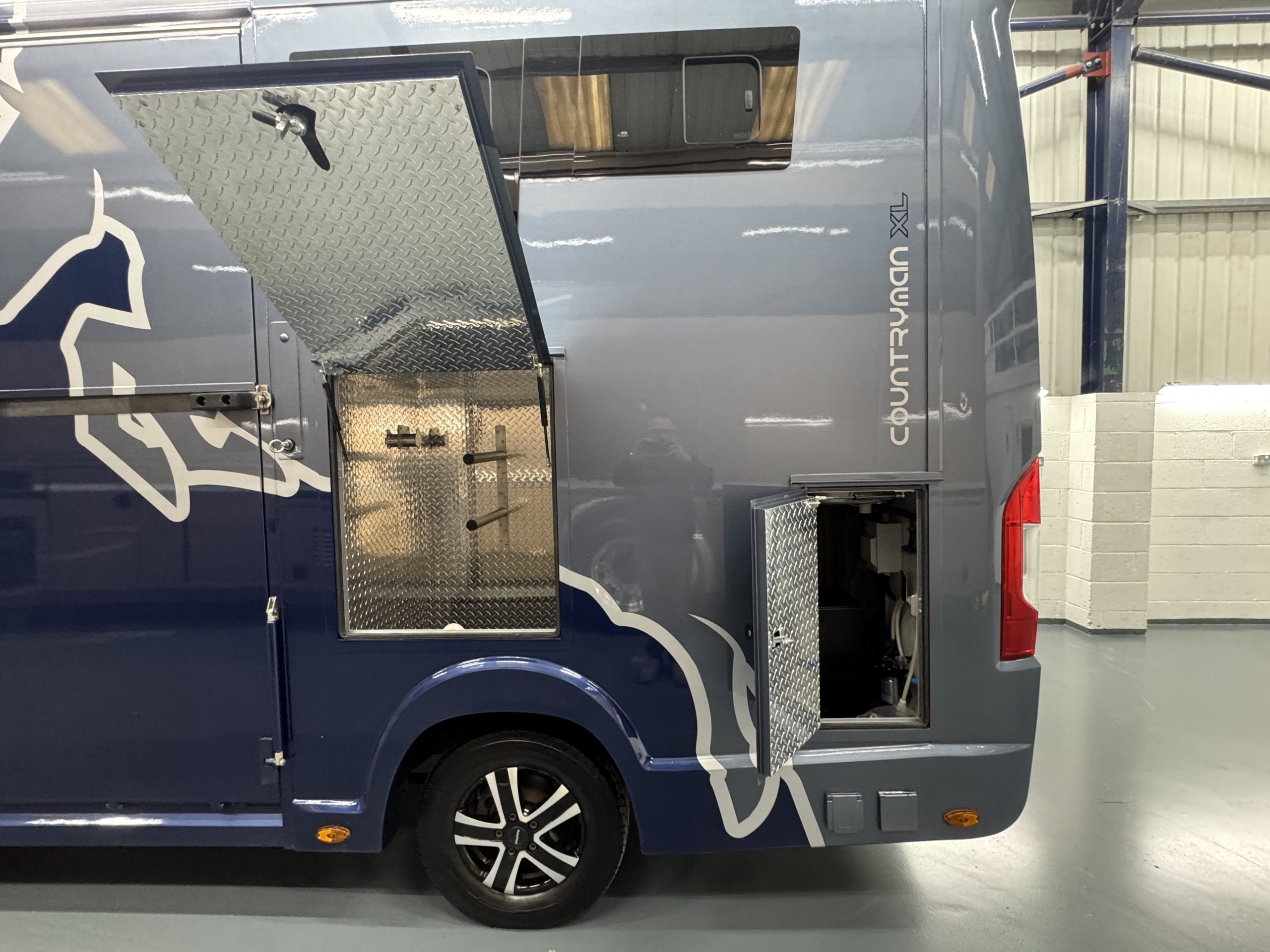 Outside we have an External Tack Locker for Two Saddles & Briddles, Gas Bottle Locker, Horse Shower Connection Point, Mains Hook Up point and Reverse Camera. Finished off with our Bespoke Paint Scheme and Alloy Wheels.