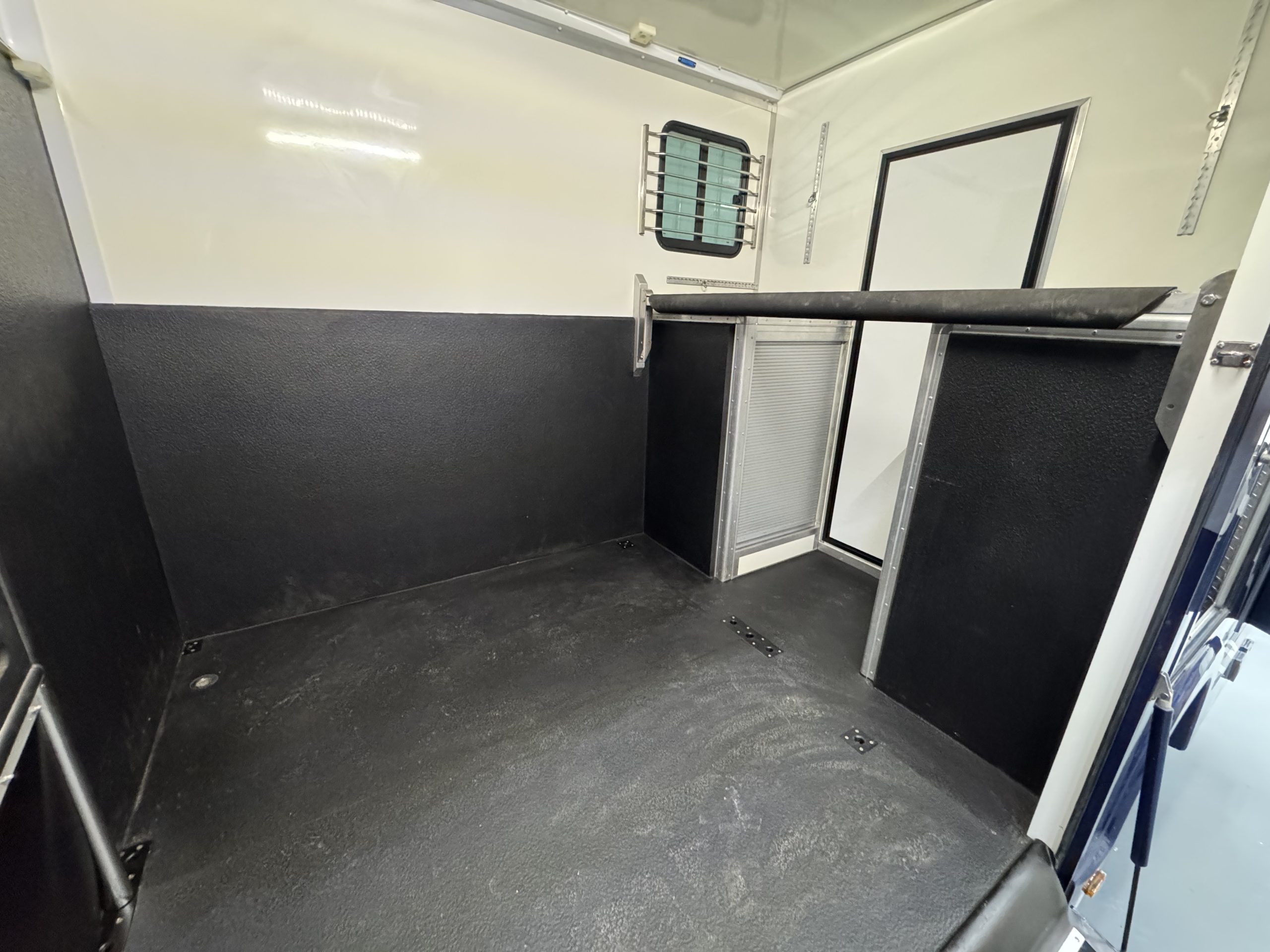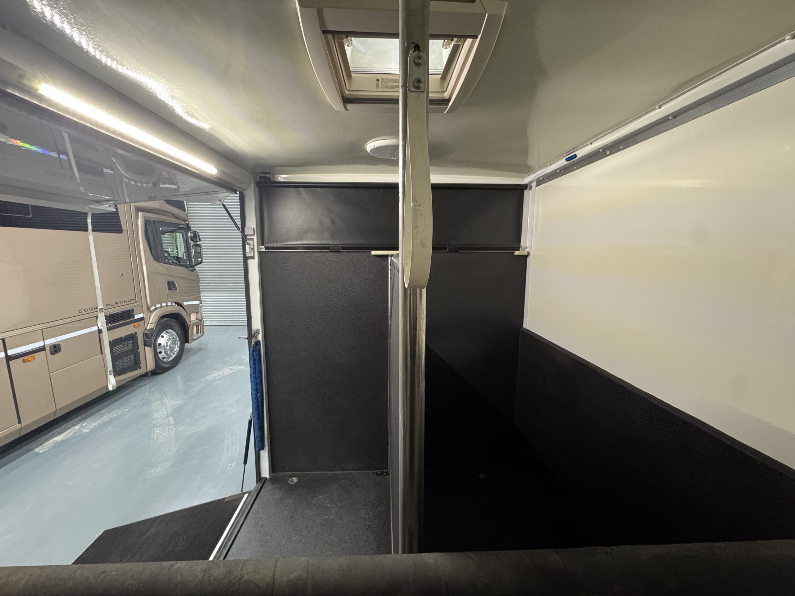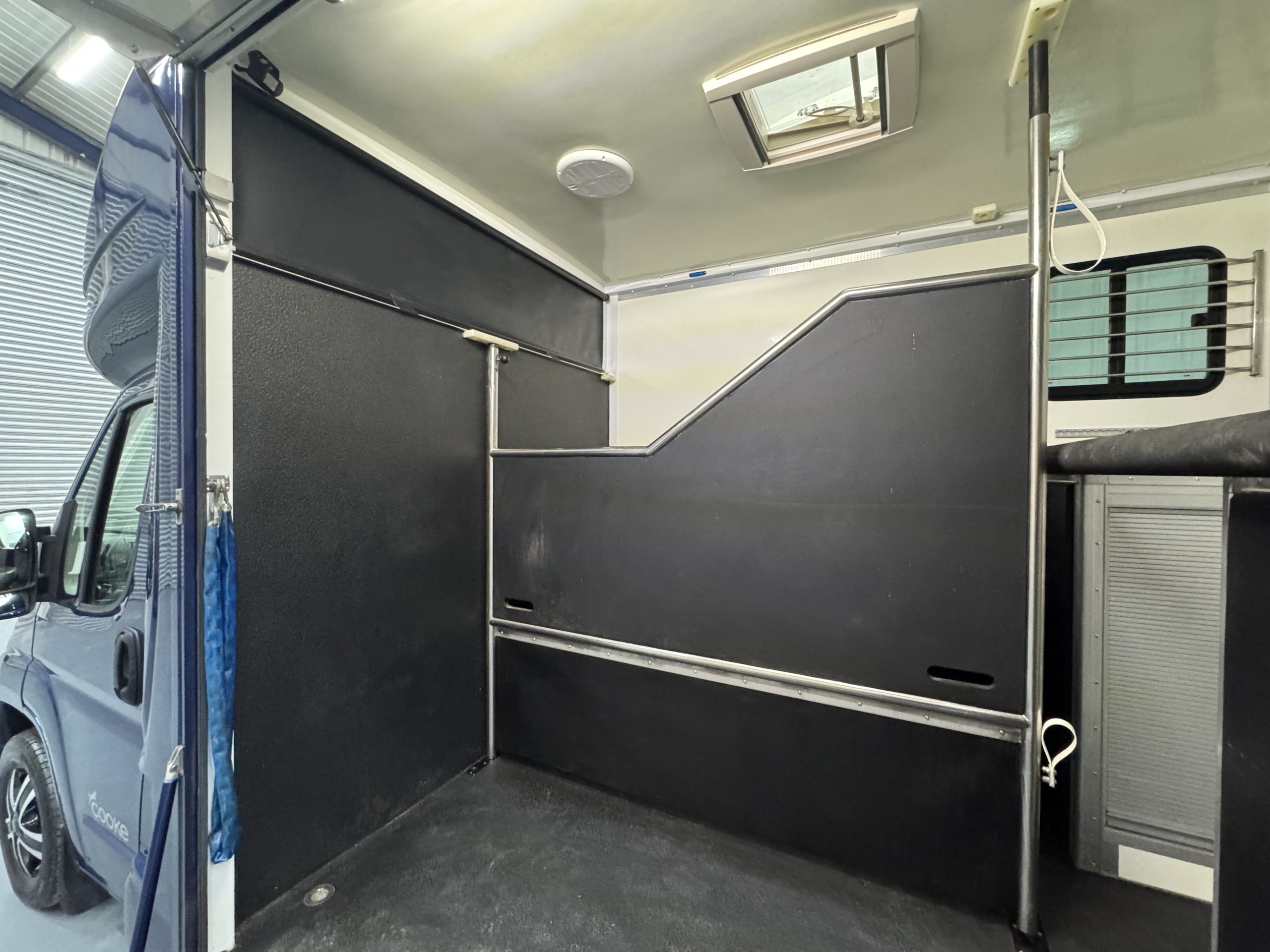 Horse Area is Equipped with Stainless Steel Swan Neck Partition, Night Travel Lights, Roof Vent, Electric Fan and Camera. Storage Above Luton and Internal Tack Locker with Shelves and Roller Shutter Door.
