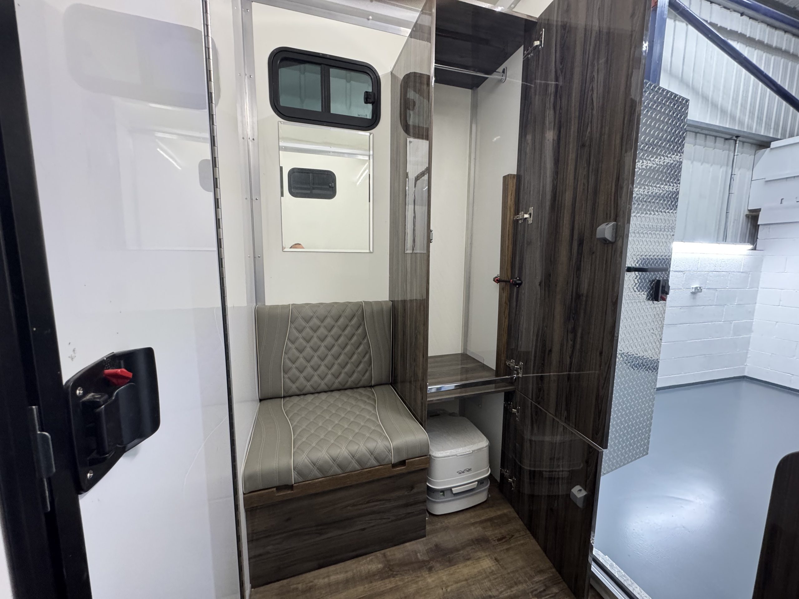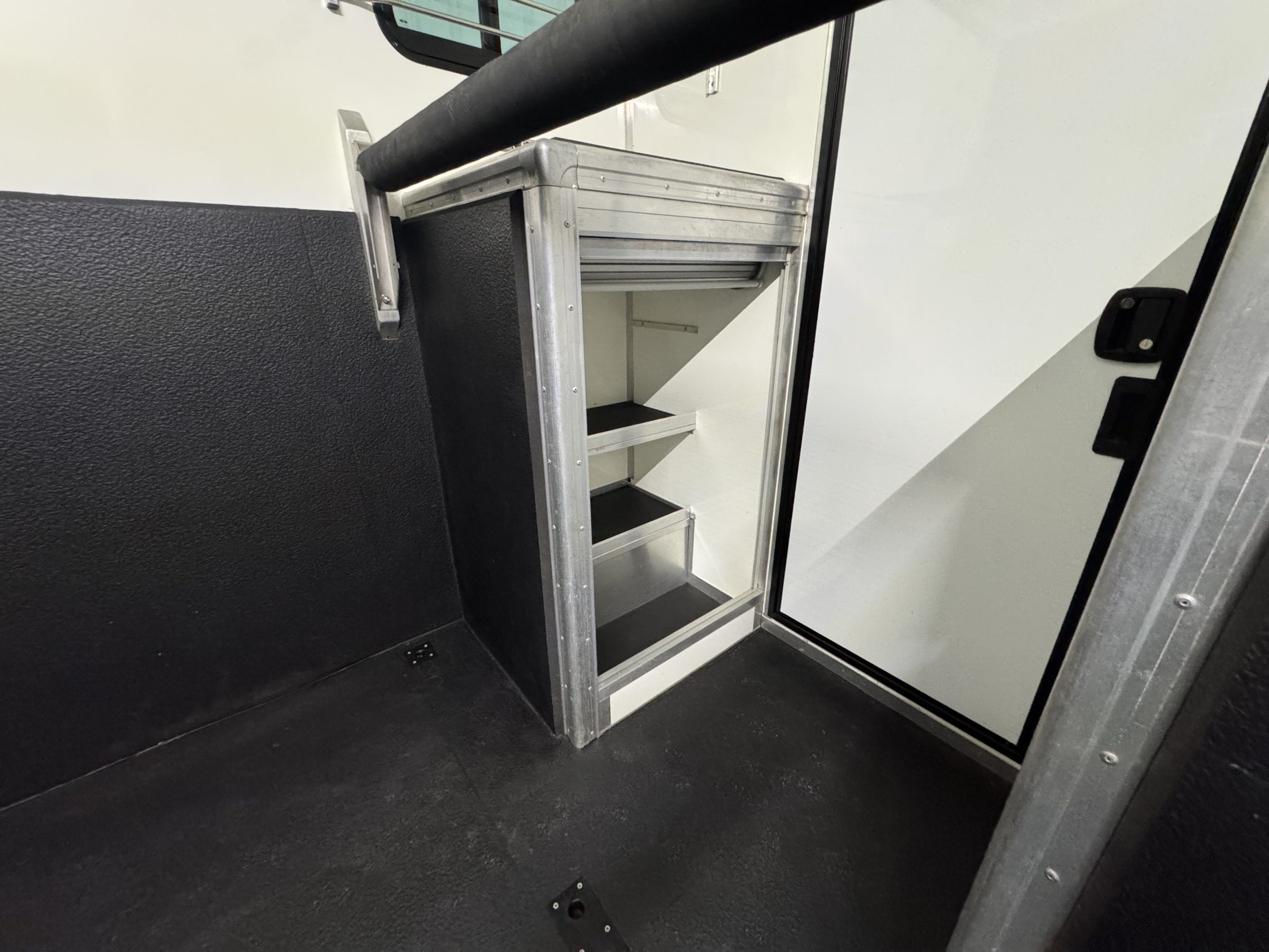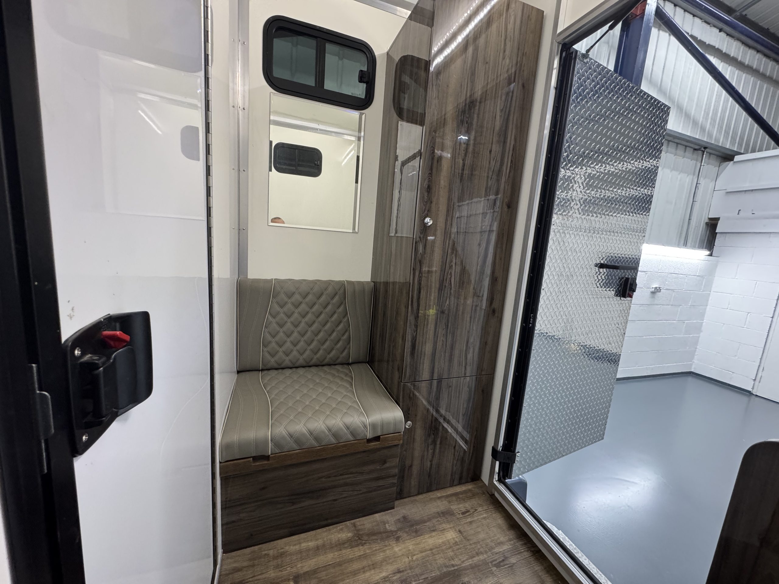 Horse Area is Equipped with Stainless Steel Swan Neck Partition, Night Travel Lights, Roof Vent, Electric Fan and Camera. Storage Above Luton and Internal Tack Locker with Shelves and Roller Shutter Door.