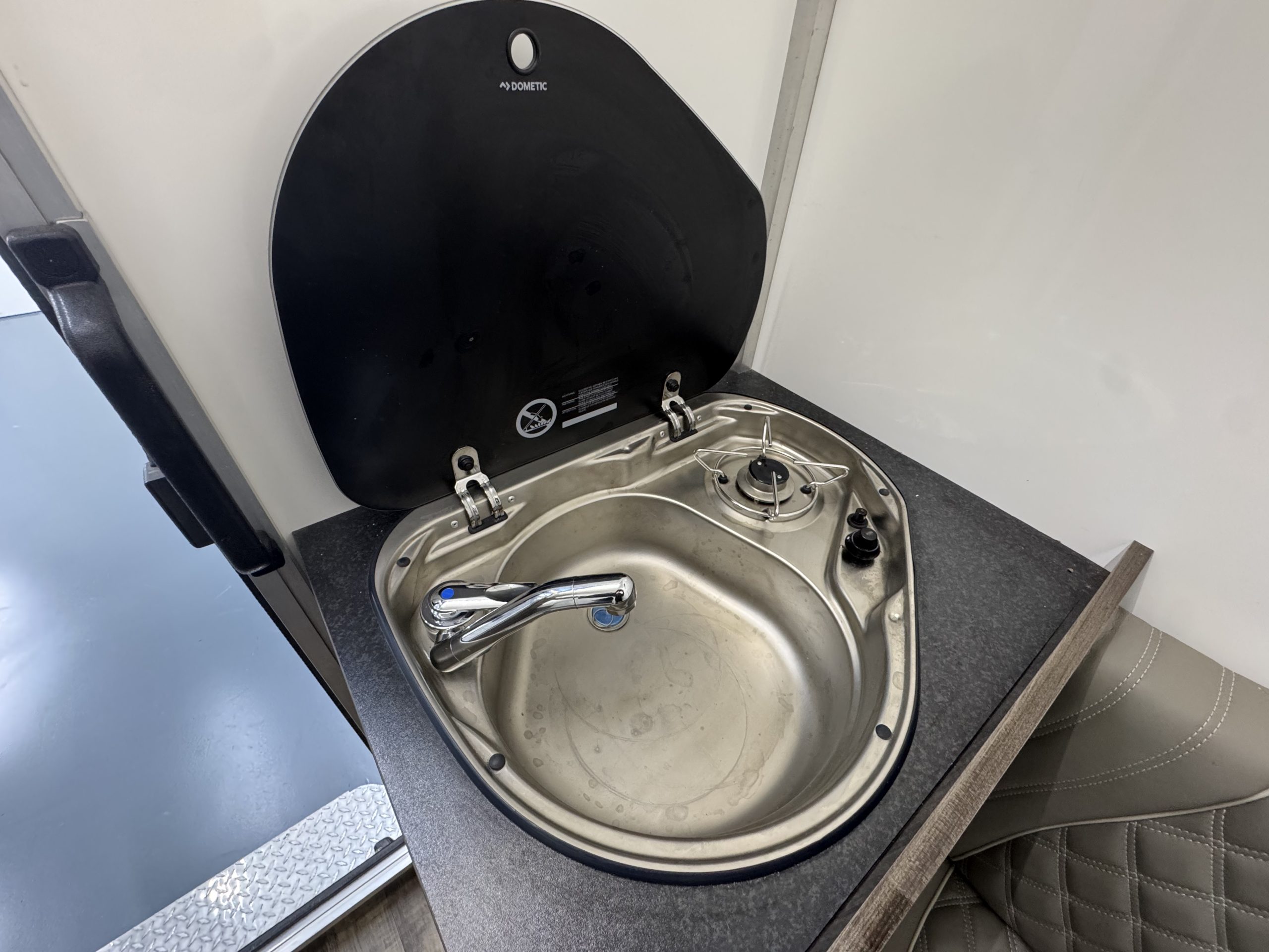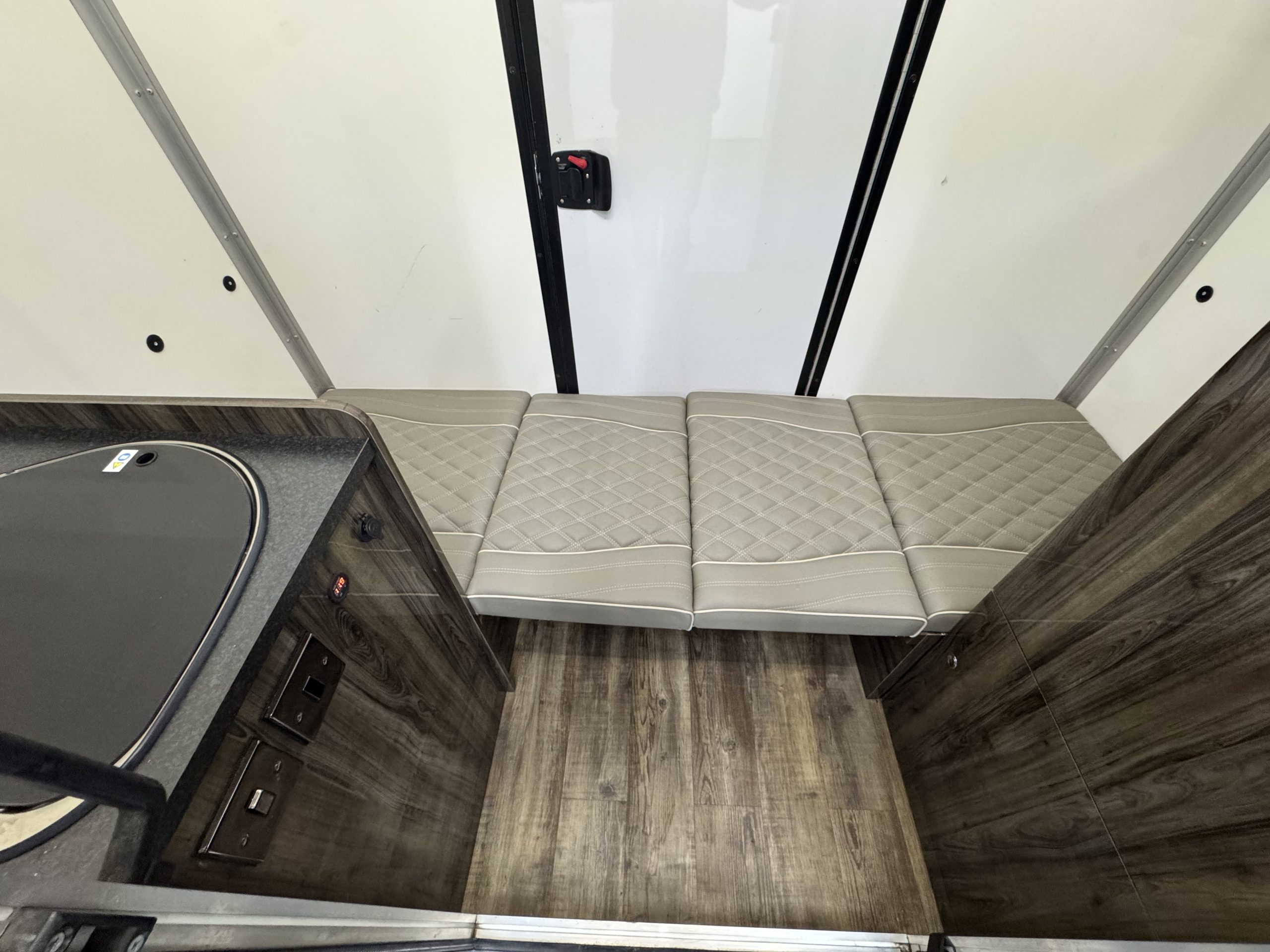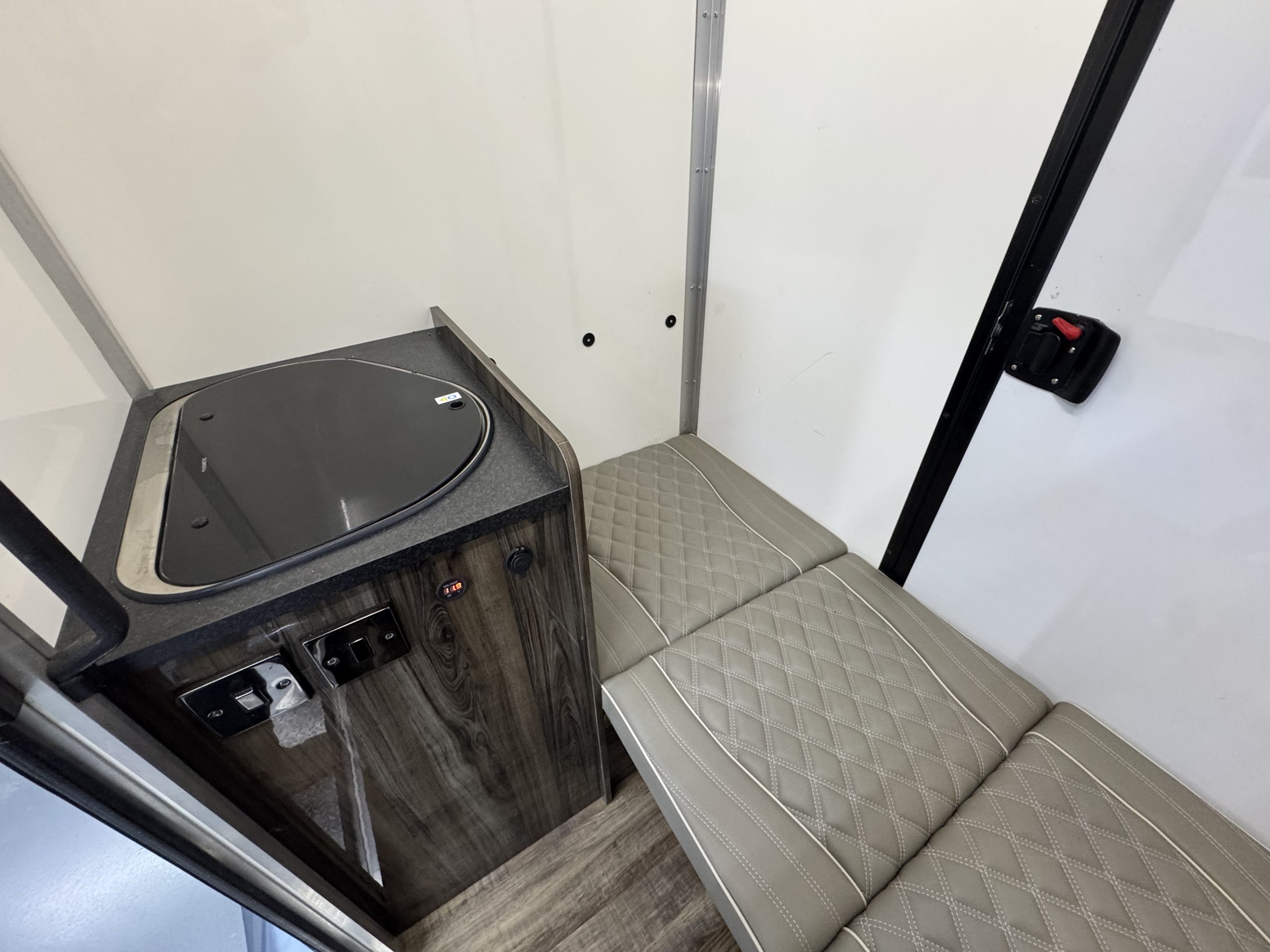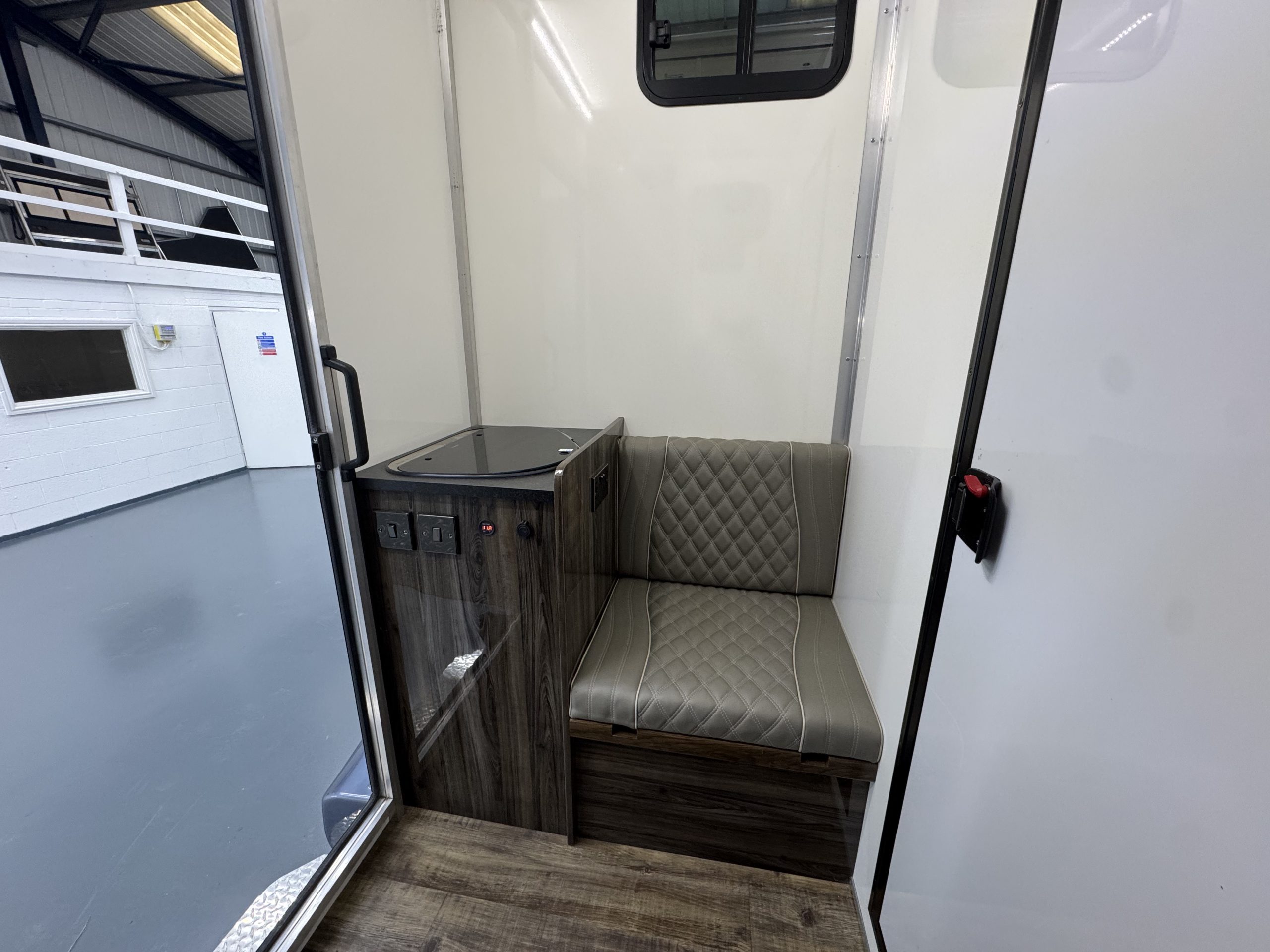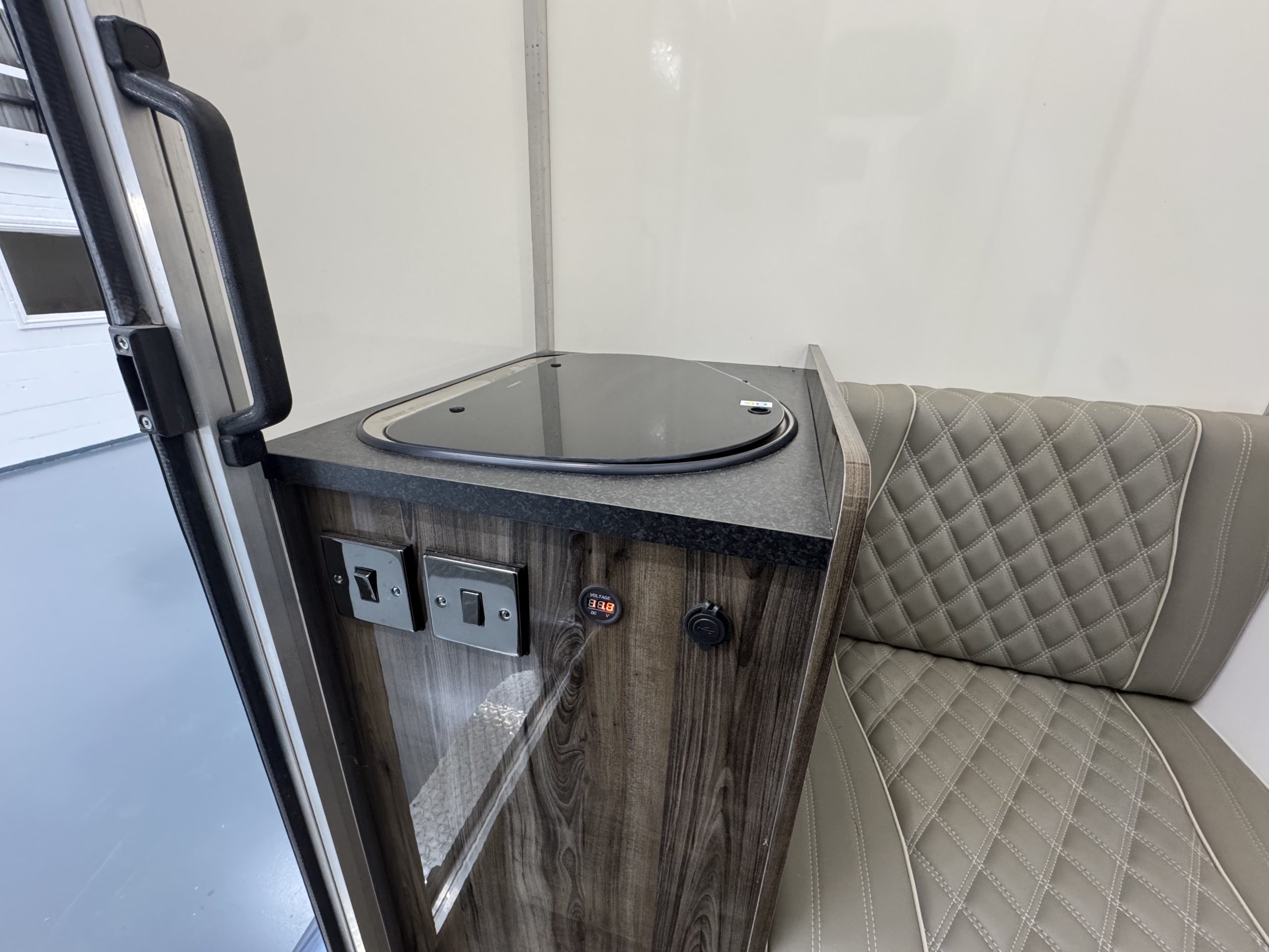 Day / Overnight Living, Sleeps 1, Mains Hook Up with Double Socket, Combi Sink & Burner, USB Charging, Digital Battery Display, Large Wardrobe with Cupboard / Porta Loo Below and Karndean Flooring.