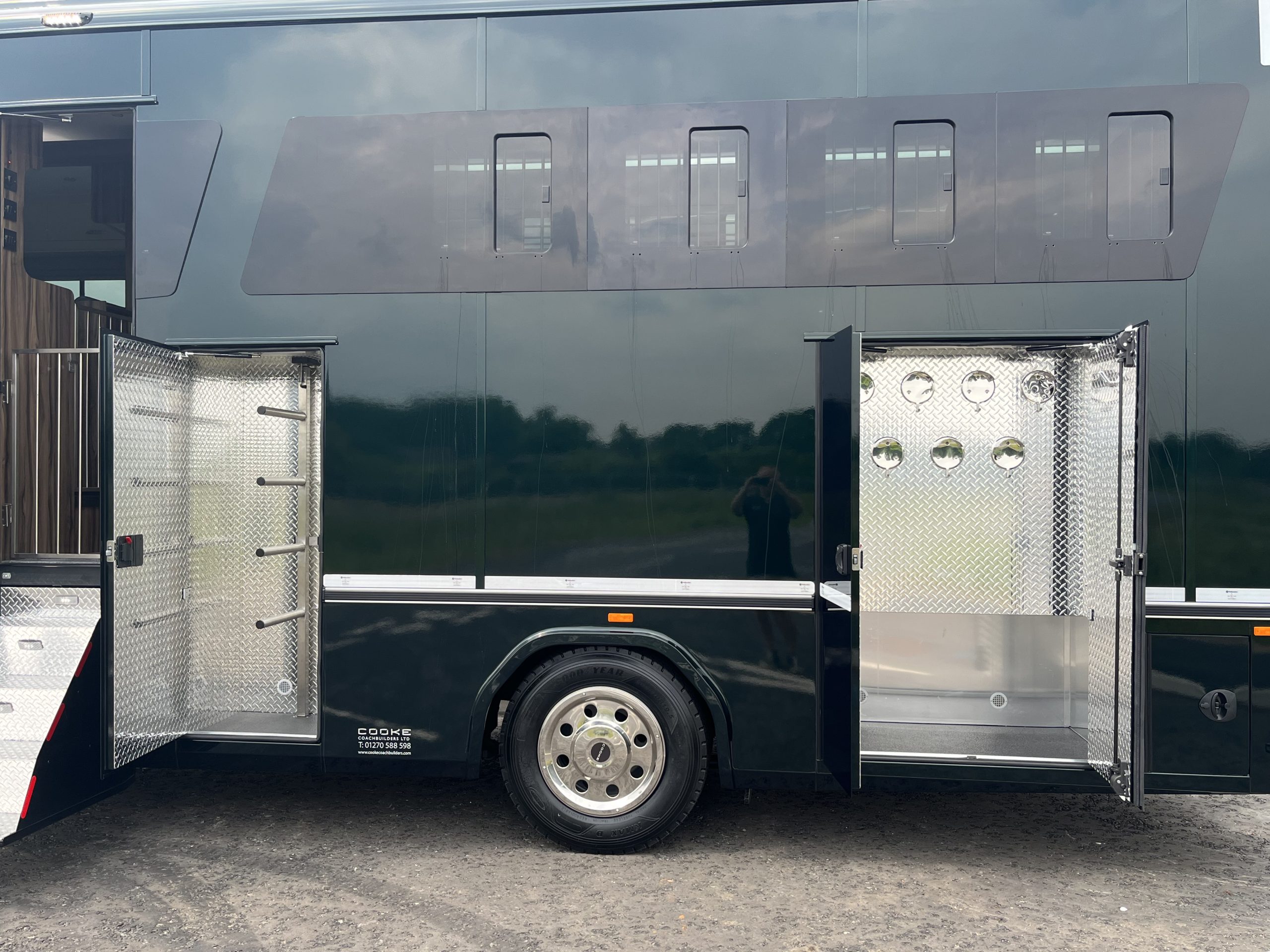 The 14 tonne horsebox from Cookes Coachbuilders is another example of fine craftmanship and beautiful design. Boasting four stalls complete with a hydraulic ramp, bonded teardrop windows, and dual camera system, this horsebox makes a comfortable home on the road. Find the complete specification and optional extras below.